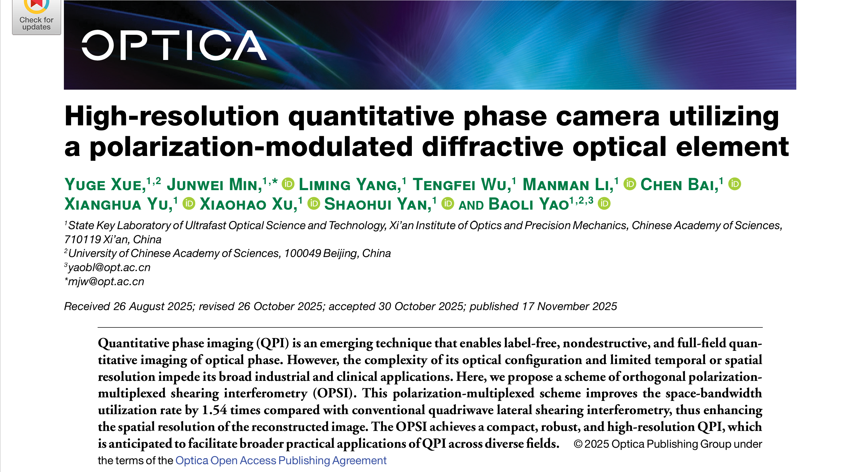 近日,超快光科學(xué)與技術(shù)全國(guó)重點(diǎn)實(shí)驗(yàn)室姚保利研究員團(tuán)隊(duì)在定量相位成像(Quantitative Phase Imaging, QPI)領(lǐng)域取得了重要進(jìn)展,相關(guān)研究成果發(fā)表于光學(xué)領(lǐng)域國(guó)際著名期刊Optica。論文第一作者為中國(guó)科學(xué)院西安光...